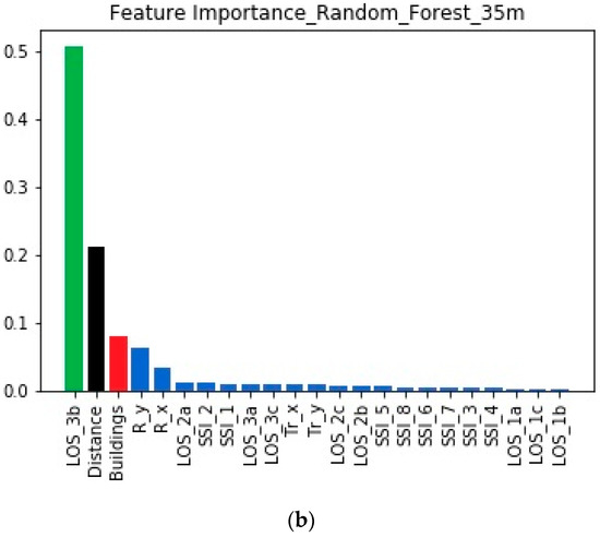 Comparing the inner rankings among the three most important features, it is clear that Buildings outperforms the other features when the transmitter is placed at 30 m. The situation clearly changes when elevating the transmitter to a height of 35 m, in which case LOS_3b becomes the most important feature for this scenario.