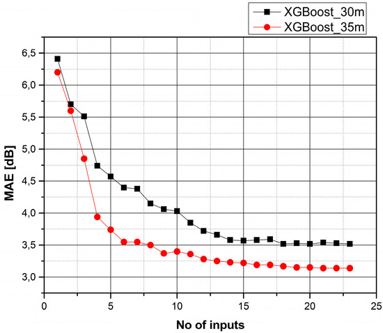 The XGBoost model obtains the minimum MAE value with a smaller number of trees for an optimum input subset of 18 features (for the 30 m case).