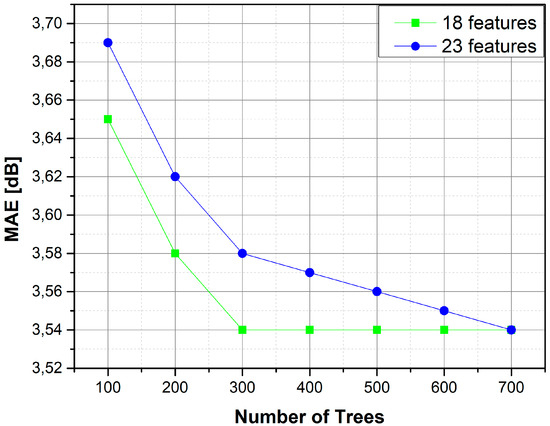As Figure 6 suggests, the subset of the 18 most important features leads to the same MAE with that obtained when using the full set of 23 features (for the 30 m case). Thus, the application of models with lower complexity can be attempted because fewer features are required. An investigation of the number of trees, the features used, and the MAE value is shown in Figure 7.