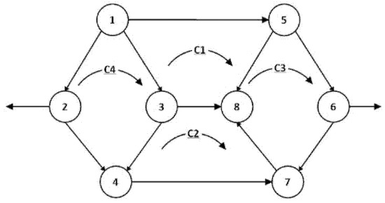 Figure 1 depicts a subnetwork in which the nodes and the cycles are labeled, and a direction was defined for the links and cycles as previously discussed. Note that for example cycles c1 and c2 are adjacent through the common link connecting nodes 3 and 8. The two cycles can be merged as shown in Figure 2, following the method of [7,9]. Notably, we obtain a larger cycle by removing the adjacent link of the two cycles. Algebraically this can be obtained by adding either the rows or the columns describing c1 and c2 in the matrix LC, as described by [7]. Notably, LC is the cycles Laplacian of the network and it is obtained using the cycles–links incidence matrix: LC = B*BT.