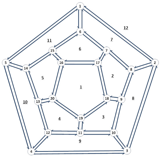 We label the cycles of the dodecahedron in underlined numbers and choose a random orientation for each cycle (clockwise for the inside cycles, counterclockwise for the outside one). Adjacent cycles, such as 11 and 6, have one link in common; however, this link is traveled in one direction in one cycle, and in the opposite direction in the adjacent one. As we will indeed show, when de-duplicating the links into graph arrows, this allows us to associate the direct graph arrow to one cycle, and its inverse, to the other. In Table 1, we present the graph-arrow description of the cycles, in which we have deduplicated the links into two arrows which are inverse to one another. This table shows the correspondence between nodes and cycles, and can furthermore be used to generate the cycles–links incidence matrix B.