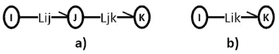 In this section we define graph arrows as an algebraic object, then proceed to describe operations on such objects. We depart from a (finite) set of nodes N. We define an arrow as an ordered tuple with . Intuitively, this object will correspond to a directed arrow from node I to node J, as depicted in Figure 3: