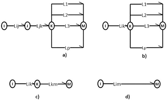 We begin from the complex graph in Figure 8a. By a serial composition on the first three nodes we would obtain the graph in Figure 8b. The parallel composition of the arrows in the right-most node yields Figure 8c. Finally, a renewed serial composition yields the arrow in Figure 8d.