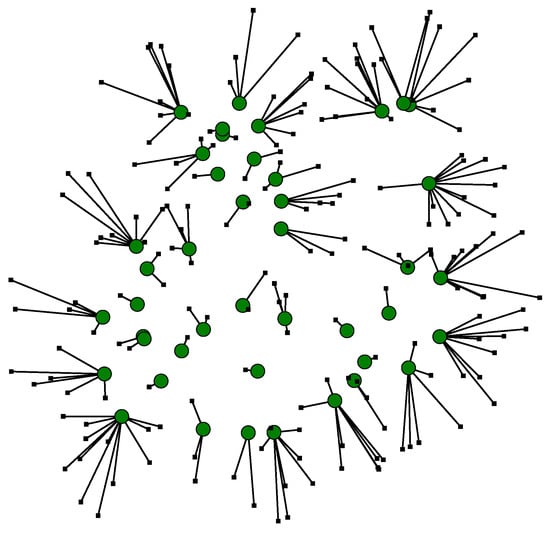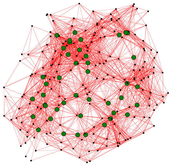 Figure 1 shows an example of the connectivity layer of a Wi-Fi network with 49 APs and 245 STAs. From this figure, it is easy to explain a concept that will be used later on in this work—that is, the concept of a cluster. As can be seen in the figure, the whole network is composed by a set of APs, each one with a set of STAs attached to it. With this, we define a cluster as one of those sets of an AP and its attached STAs. On the other hand, Figure 2 shows, for the same example scenario, the resulting interference layer.