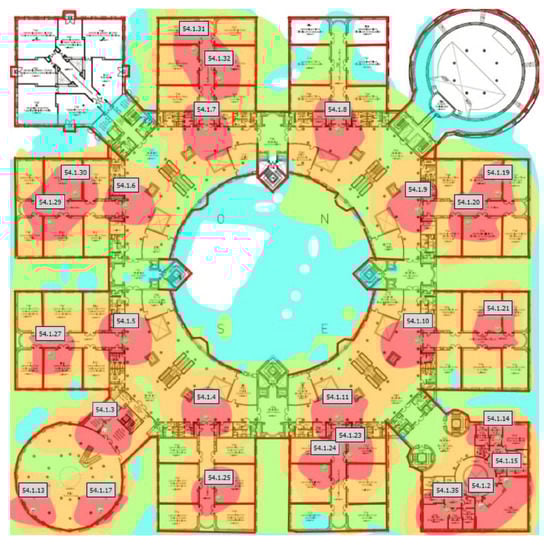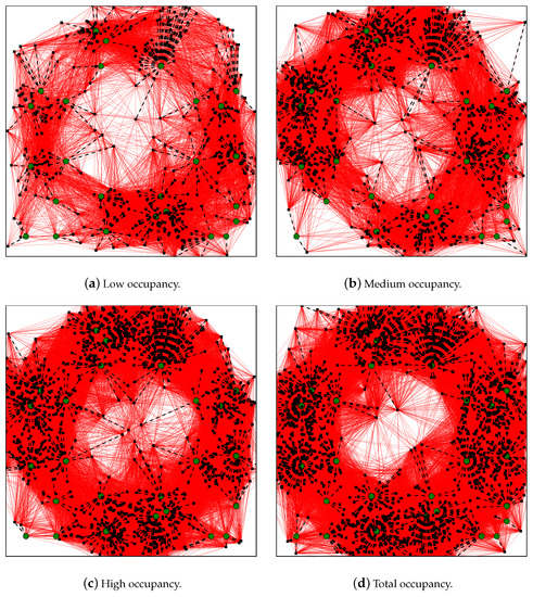 We have chosen a realistic layout to compare our proposal with other well-known channel assignment techniques. This layout is the first floor of the Polytechnic School of the University of Alcala (Spain). This building is square-shaped, with sides approximately 130 m long. We have used the real positions whereat the 26 APs are located in the building, which are shown in the heat map displayed in Figure 4. In this figure, signal coverage ranges from light blue (low coverage) to red (high coverage). The reason for having such a low coverage in the center of the setting is because it is a central courtyard. Regarding the positions of STAs, they are not included in Figure 4, because their positions will depend on the occupancy of the building. In a university campus, students will be mainly attending classes, but there are also a number of students in the buildings involved in different activities (studying, preparing assignments, labs, etc.). For that reason, in all of our settings we have considered that there are 100 randomly located STAs in the plant. Moreover, we have considered a varying number of classrooms under use. In the first floor plant of the building there are 48 classrooms, so in our different settings we have considered 12, 24, 36 and 48 classrooms simultaneously under use, to represent different occupancy settings, being: low, medium, high and total occupancy, respectively. For each of this occupancy settings we have considered two scenarios. For example, in the low occupancy setting, where 12 from a total of 48 classrooms are in use (), these 12 classrooms are chosen randomly, so we have tested two different choices. In each classroom that is under use, we have considered that there are 25 students randomly located in that classroom using a normal distribution around the center and a standard deviation of  m. To summarize, and for example, the two scenarios of low occupancy (25% of the classrooms under use) have 100 STAs randomly located and  STAs, giving a total of 400 STAs. With a similar reasoning, for the medium, high and total occupancy settings, we will have 700, 1000 and 1300 STAs, respectively. In Figure 5 we show the resulting graph for one the scenarios for each classroom occupancy. Note that in those figures we have overlapped both connectivity and interference layers into a single picture. Again, we have used large green circles to represent APs, small black squares to represent STAs and red lines to represent interferences. To distinguish interferences from STA-AP associations in the same picture, we have used black-dashed lines to represent the association between APs and STAs.