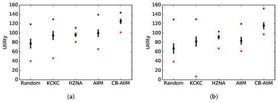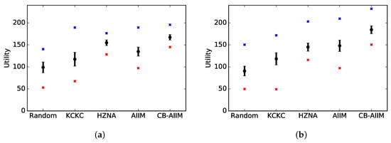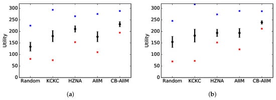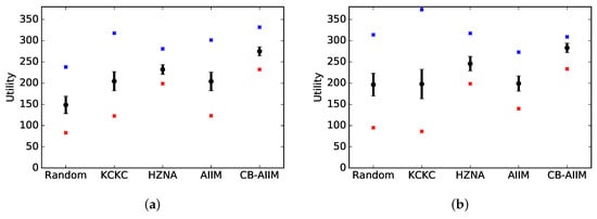 Figure 6, Figure 7, Figure 8 and Figure 9 show the results of the performance comparison of the abovementioned techniques. In these figures we show the global utility (see Section 2.3) of the channel assignment obtained by the different techniques. To obtain the results, all the experiments have been run 20 times. For each technique and in each of the eight settings, we show the average utility obtained, along with the 95% confidence intervals (in black) and the utility of the best and the worst execution (maximum and minimum utility, shown as blue and red crosses, respectively). As we can notice by inspecting Figure 6, Figure 7, Figure 8 and Figure 9, there are not significant differences in the conclusions that can be obtained depending on the classroom occupancy. As expected, the utility when there are more wireless devices in the network is higher (when the classroom occupancy increases), but the relative performances of the different techniques do not depend on the density of the Wi-Fi network.