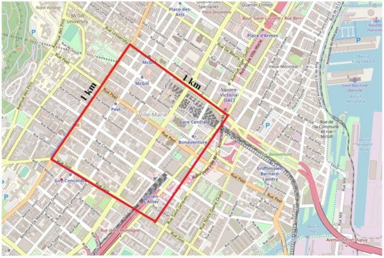 In this paper, the following five variables were considered: the number of vehicles (v), data rate (), DSRC transmission power (), LTE transmission power (), and LTE bandwidth (b). Based on the studied literature related to ETSI and the Wireless Access in Vehicular Environments (WAVE) standardization, these parameters have the most effect on network congestion problem [,,,,,,]. Because no data sets from real HetVNET are available today, we have generated a data set that contains data records of these parameters []. We used OpenStreetMap (OSM) [] to have a map that is similar to the real environment in terms of intersections, streets, buildings, etc. Figure 1 shows the boroughs of downtown Montreal that we used to generate the simulation scenario. Besides, to generate the road traffic and vehicle movements on the map, we used Simulation of Urban Mobility (SUMO) 0.26.0. []. SUMO requires “.osm” file created by OSM to generate the vehicle traffic on the map. Simultaneously, Veins LTE version 1.3 [] simulator was used to generate heterogeneous vehicular network using IEEE 802.11p for V2V communications and LTE for Vehicle-to-Infrastructure (V2I) communications. SUMO and Veins LTE worked on Ubuntu 16.04. The simulation time was 1000 s and, in order to generate a high load of data, we defined a road accident with a 70 s time of running simulation scenario. Because we considered the downtown of Montreal city, the vehicles maintained the maximum speed limit of 40 km/h assigned to these boroughs. Table 1 shows the parameters and their corresponding values used for simulating HetVNET scenarios. In each run, the values of the five attributes were changed based on the information presented in Table 1.
