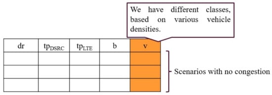 Information was extracted after running simulation scenarios of HetVNET. The amount of network throughput over generated data rate can give us a vision of the network performance, as explained in []. Indeed, based on this value, we can find out how many of the generated data were successfully received at destination points per unit of time. Therefore, for each run of simulation scenario, the amount of network throughput over load per a unit of time is extracted. This value can be equal to one maximally in the desired case, and equal to zero minimally in the worst case of network performance. Network throughput is the calculated sum of the value of throughput in DSRC and the value of throughput in LTE. To meet the paper objectives, we used information of successful experiences (simulation runs). Simulation scenarios with a network throughput value over the generated data rate of more than 0.6 are selected as a successful scenario []. In fact, we need to extract the best scenarios in HetVNET and augment these successful scenarios. Subsequently, we put the information of these scenarios in the dataset. As shown in Figure 2, the data records in the dataset are classified based on the number of vehicles. Based on the five vehicle densities considered, there are five different classes of vehicles in this paper: 30, 50, 100, 150, and 200 vehicles.
