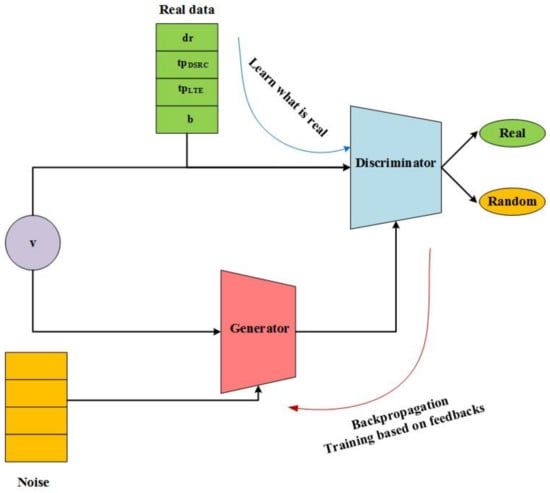 Because the velocity of change in HetVNET and requirements is high and varies, using the same slices for a long time is risky; therefore, the ability of the slices to meet all of the network requirements is not guaranteed. Instead, we can generate network slices based on previous successful network experiences. It is like making new generation of HetVNET slices from a strong population. With this vision, on one hand, the risk of having slices with low performance is reduced and, on the other hand, it affects the performance of the entire HetVNET over time by creating a good generation of slices. When considering the literature related to network congestion in vehicular network, using WAVE and ETSI standards, the proposed congestion controlling mechanisms are mostly based on tuning the value of transmission power and data transmission rate [,,,,,,]. Finding the optimal value for these parameters is not a promising solution, due to the high dynamicity of the vehicular network. In other words, there is no optimal fixed value for these parameters, instead, the appropriate value should be applied temporarily for these parameters during a predefined time interval and just based on the current network situation. These values are similar (not equal) to the values that were previously used and made successful network experiences. In this work, the synthetic data generated by the proposed CGAN are the data close (not equal) to the original ones that came from the successful scenarios. Therefore, we create the most similar data with little variance to the previous successful ones to apply in network slices. When considering the wide applications of Generative Adversarial Network (GAN) in producing new images, by our proposed approach, we can generate several images for each part (slice) of vehicular network (let us assume that, in this problem, images are the network various configurations in terms of the five variables). These generated configurations can be applied in various slices with different number of vehicles. Therefore, providing network slices with the appropriate value for the five parameters that are tailored to the current network situation in terms of the number of vehicles is proposed in this work. The proposed CGAN method can quickly generate a volume of information useful in creating and setting many HetVNET slices with respect to the network service needs. When considering the five variables of v, , , , and b and their possible real values, in each time, the number of possible templates for the slices can be calculated by multiplying the number of possible values that each of these parameters could have. Subsequently, these templates can be categorized based on the number of vehicles.