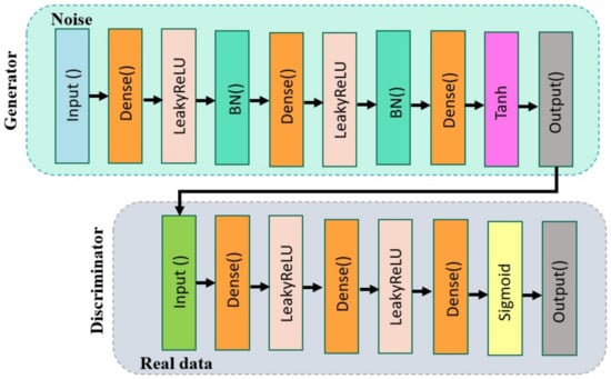 A uniform distribution is used to generate random noise while using the generator. Moreover, we used the Adam optimizer [], which has high convergence speed and is faster than the gradient descent. Batch normalization is applied in the generator in order to avoid the problem of vanishing gradient in back propagation. Indeed, a batch normalization layer is added after each hidden layer’s activation function, with a momentum of 0.9 being recommended in [], as a suitable value. Furthermore, Leaky ReLU is preferred as the activation function (the learning rate is 0.001), since it is effective in reducing the run-time latency []. Besides, He initialization is applied, which best fits the Leaky ReLU activation function []. Tanh and Sigmoid activation functions are used for the output layer in the generator and the discriminator, respectively. Figure 4 shows the layers of the CGAN.