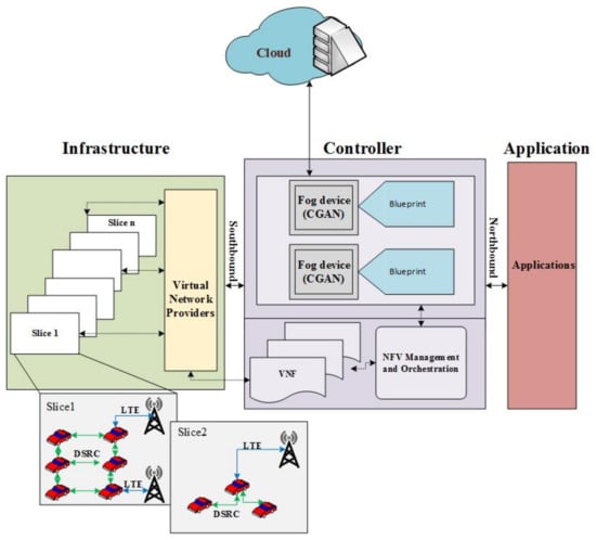 Figure 5 shows the three layers of SDN. In this architecture, fog devices are implanted at the controller in order to execute the CGAN algorithm. The high computing and storage abilities of fog devices are helpful for running the CGAN. The NFV is a fundamental component of network virtualization and the creation of slices. Information extracted from the successful scenarios is augmented at the controller, and this information is useful for making blueprints. The NFV has the required functions to establish the slices. Therefore, the blueprints are passed to the VNFs by NFV management and orchestration.