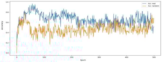 Figure 6 shows the accuracy of the discriminator over 500 epochs. In the first 50 epochs, the discriminator could distinguish between random and real data. However, after that, the discriminator made mistakes in finding the random data sent from the generator. This illustrates the improvement of the generator in making data from noise which are similar to real data. At the same time, the discriminator was still successful in finding real data. However, in epoch 300, the CGAN model reached a converging point where the discriminator could not very well recognize the real data. At this point in time, and as shown in Figure 6, the accuracy of the discriminator is reduced to approximately 50%, which indicates that the discriminator randomly generates output labels. Therefore, the generator trained itself very well while using feedback from the discriminator, and finally the CGAN model converges at this point in time.
