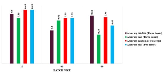CGANs with two and three hidden layers were separately considered and, for each, the accuracy and loss of the discriminator was evaluated using three batch sizes of 20, 40, and 60. Finally, Figure 7 and Figure 8 present the results. Figure 7 shows the variation in the accuracy of the discriminator at the converging point of the CGAN for real and random data, whiel using two and three hidden layers and three different batch sizes. The best state for a CGAN is when the discriminator randomly makes labels []; therefore, the accuracy of the discriminator will be approximately 50% for both the real and random data. As far as this is concerned, and as Figure 7 shows, this has happened with 40 batch size and two hidden layers. At this state of the converged CGAN, the discriminator with 55% accuracy guesses whether the data are real or random.