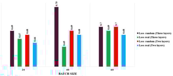 We use binary cross-entropy to calculate the loss of the discriminator. The best state is when the loss of the discriminator is at the lowest value for both real and random data. The loss of the discriminator for three hidden layers of 40 batch size is a good value like 0.65; however, the loss for random data is as high as 0.75, as shown in Figure 8. In other words, the discriminator has more faults in finding random data and performs better in recognizing real data. This is a green sign that indicates that the generator is well trained. However, as compared to the same batch size, but with two hidden layers, this is a hasty conclusion. Because, with the same batch size and two hidden layers, the loss values for real and random data are very close 0.68 and 0.69, respectively. These values show that the discriminator has almost the same performance in labeling the real and the random data. Therefore, we can say that the discriminator has an error in finding both the real data and the random data at a same level. This indicates that the generator is well trained in making the discriminator’s mistakes.
