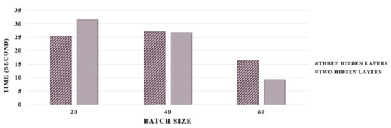 Figure 9 compares the training time that is required by the proposed CGAN to reach a converging point for two and three hidden layers using different batch sizes. The training time for the CGAN using a batch size of 60 and two hidden layers is the lowest, with a value of less than 10 s. The reason for this low training time could be related to the high amount of data that the CGAN has during the training phase as compared to using the other batch with small sizes.