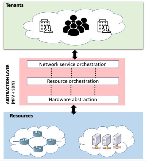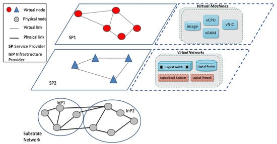 In traditional networks, the users have requested services through a very complex and static infrastructure. All the components, such as nodes, links, and resources, were strongly dependent on the hardware layer. Moreover, the traditional architectures are mainly characterized by their high cost, non-flexibility, and non-scalability. In fact, introducing new physical equipment and/or functionality requires more time, more cost, and more resources since it is needed to respect the different protocols, standards, and technologies already installed in this complex architecture. To this end, network virtualization [4] has gained more and more attention because it makes the network not only independent from the hardware but also enables services with low cost and with more flexible resources management, setting, and control. For instance, this technology solves many networking challenges in today’s data centers, helping organizations centrally program and provision the network.