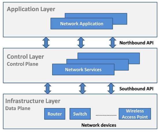 Figure 2. SDN layered architecture. - NFV: The NFV paradigm aim is to decouple network functions from dedicated physical equipment by using virtualization technology, and runs the virtual network functions (VNFs) in the general purpose physical or virtual network appliances. To conclude, the main difference between the SDN and NFV architectures is the overall focus network management responsibilities, and the standards controlling the architectural and functional deployment.