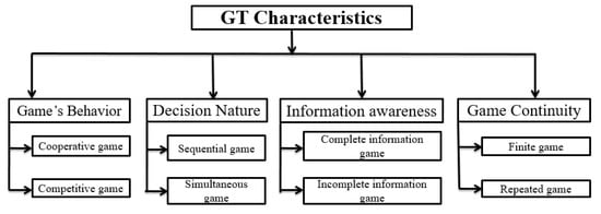 The game theory approaches for the NV can be classified based on player’s behavior, the nature of the player’s decisions, the information awareness, and the game’s continuity. The first criteria for our further classification of the NV solution are the GT characteristics. Figure 5 illustrates the first classification criteria defined as the GT characteristics, and Table 1 shows the classification of the game theoretical approaches for the NV in terms of GT characteristics. Each game is characterized by a specific deterministic behavior, unique decisions nature, type of shared awareness information during the game, and game’s continuity.