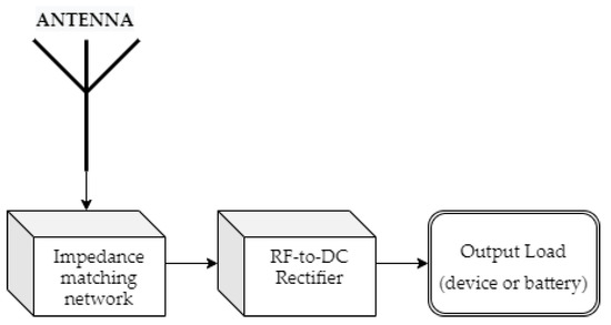 The rectifying antenna (rectenna) is a joint system of an antenna and an RF-to-DC rectifier. The antenna is responsible for capturing the ambient RF electromagnetic energy, whereas the rectifier converts the input AC voltage into DC voltage, able to feed low-power electronic devices. In many cases, an impedance-matching network intervenes between the RF-to-DC rectifier and the antenna, to adjust the impedance between these two elements. Brown [22] invented the first rectenna in the early 1960s. Since then, the technological revolution has encouraged researchers to design and fabricate more efficient and sophisticated circuits. Figure 1 illustrates the basic block diagram of a rectenna system.