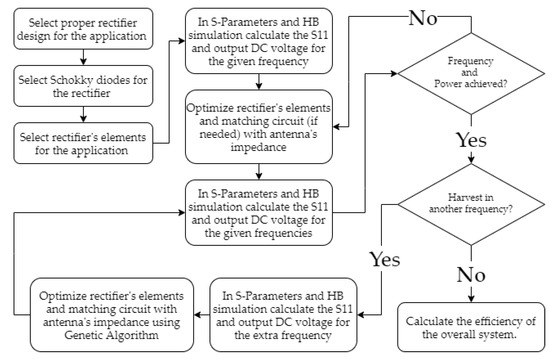 The rectifier circuit is at the heart of an energy-harvesting module. It is responsible for converting the received RF power into DC voltage, sufficiently enough to charge a battery or feed battery-free low-power electronics. It is decisive in providing high values of RF-to-DC power conversion efficiency and operating in multifrequency bands to convert as much ambient RF energy as possible. One of the most established approaches to design an RF-to-DC rectifier is the Schottky diode-based rectifying circuit [23]. Figure 2 illustrates the design process of the proposed Schottky diode-based rectifier, as well as the main considerations that are taken into account. Based on Figure 2, the first steps of a rectifier’s design were to select the appropriate circuit type and elements (Schottky diodes, resistors, capacitors). The Schottky diode, to which is attributed a low forward voltage drop and low substrate leakage, can improve the RF-to-DC conversion efficiency, as well as the DC output voltage [24,25]. Thereinafter, we calculated the S-parameters, the power conversion efficiency (PCE), and the DC output voltage of the system using the Advanced Design System (ADS-© Keysight Technologies 2000–2021). The variations of the rectifier’s input impedance with the RF input power resulted in the use of the Large-Signal S-Parameter simulation tool of ADS. Depending on the outcomes, the next steps involved the tuning of the physical parameters of the impedance-matching network to adjust to a standard antenna port of 50 Ohm and the recalculation of the previously mentioned parameters. We repeated the same procedure for every frequency of interest until we met the desired criteria. Finally, we computed the efficiency and DC output voltage of the overall circuit as a function of the incident RF input signal.