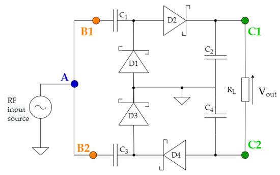 In this work, the HSMS285C (SOT-323) Schottky barrier diode, which has a low forward voltage value of 150 mV, was utilized [26]. The generalized configuration approach of the utilized rectifier is illustrated in Figure 3. Two different impedance-matching circuits were designed to interconnect the antenna module with the branches of the rectifier [21]. The system was designed using the Harmonic Balance (HB) method in the Advanced Design System software (ADS-© Keysight Technologies 2000–2021). An FR-4 substrate (dielectric constant 4.4, substrate thickness = 1.6 mm, dielectric loss tangent 0.02, and copper thickness = 0.07 mm) was applied for the design of the utilized system. Furthermore, the Greinacher voltage-doubler topology was selected due to its higher output DC voltage against other alternative topologies for a given input power level [27]. Moreover, Park et al. [28] reported that the Greinacher voltage multiplier can be employed in high-power WPT systems, while Boursianis et al. [29] presented an output DC voltage over 420 mV for an input power equal to −10 dBm. In some cases, if we consider low-power values at the input of the rectifier, single-diode topologies may outperform voltage-doubler topologies. However, the single-diode topology was not considered in this work, due to the comparative DC output voltage characteristic of the Greinacher topology.