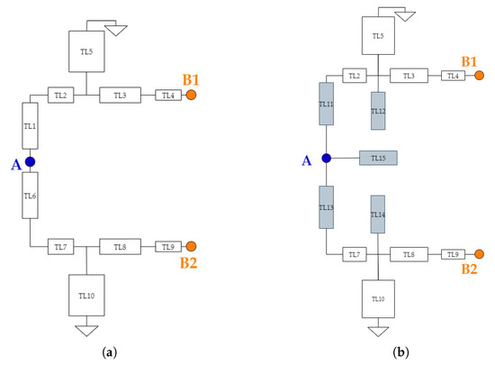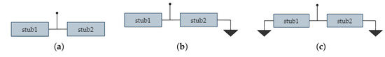 Liu et al. [30] realized dual- and triple-band circuits by using one or more parallel shunt stubs. They proved that when impedance matching is required on more than one frequency bands, more circuit freedoms are necessary for the design. They obtained the extra triple- and quad-frequency bands from a dual-band design by applying a parallel combination of two stubs to provide the needed susceptances. Figure 6 illustrates the three basic topologies of two shunt combinations, open-open (Figure 6a), open-shorted (Figure 6b), and shorted-shorted (Figure 6c). Furthermore, Song et al. [31] designed a six-band rectifier with only three voltage-doubler circuits connected in series. The presented system had an excellent performance in various conditions, such as multiple frequency bands and a wide range of input power levels.