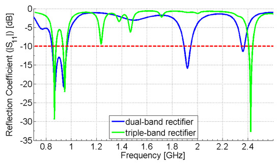 Figure 8 illustrates the S11 magnitude (reflection coefficient) of the proposed dual- and triple-band RF-to-DC rectifier versus frequency. From the presented graph, we can derive that the dual-band rectifying circuit operates satisfactorily in the European LoRaWAN frequency band (863–870 MHz), as well as in the GSM-900 mobile communication frequency band (880–960 MHz). The utilized rectifier has a dual-frequency operation (−21.89 dB at 869 MHz and −20.87 dB at 940 MHz) that falls into the previously mentioned frequency bands. It is also noteworthy that the −10 dB bandwidth of the proposed rectifier extends to 121 MHz (846–967 MHz).