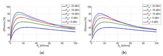 RF-to-DC efficiency vs. output load of the demonstrated (a) dual-band (for a two-tone signal: 869 MHz and 940 MHz) and (b) triple-band (for a three-tone signal: 866 MHz, 948 MHz, and 2.423 GHz) rectifying circuit for various RF input power values ().