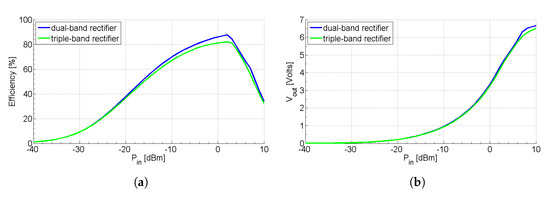 Finally, Figure 10a,b portrays the RF-to-DC efficiency and the DC output voltage versus the RF input power , respectively. From Figure 10a, we can observe that the efficiency of the dual-band rectifier is 85% for an input power level of 0 dBm (two-tone signal), whereas in the triple-band system, it is 81% (three-tone signal). For an input power equal to 2 dBm, the maximum power conversion efficiency of the dual- and triple-band circuits is 85.9% and 81.9%, respectively. One may notice that there is a reduction in the PCE of the triple-band system compared to the PCE of the dual-band system; however, this variation is indiscernible. From the results of Figure 10b, we can conclude that the DC output voltage for an RF input power level greater than −15 dBm is above 0.5 V, whereas for an input power of 0 dBm, it is 3.32 V and 3.24 V for the dual- and triple-band rectifier, respectively. Additionally, Figure 11 illustrates the RF-to-DC efficiency versus frequency for various input power levels . From the presented curves, we can verify the system’s performance in the frequency bands of interest.