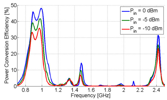where is the total output DC power, calculated by the sum of each RF power , , and corresponding to an RF input power at a frequency of = 866 MHz, = 948 MHz, and = 2423 MHz, respectively, is the RF input power, is the output DC voltage, and is the load resistance. We should point out that for an input signal of two (dual-band rectifier) or three tones (triple-band rectifier), the total power of the two or three tones is counted as the input power , respectively [33].