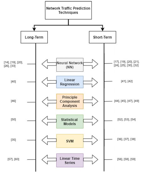 In the case where the technique is time-independent, as is often the case in predicting blocking probability, this paper will classify the technique as long-term. It is important to note that short-term predictions may become long-term predictions if deployed for a longer duration. Additionally, a technique’s purpose of prediction may be applicable for the long term, such as blocking probability estimation or power usage reduction. Henceforth, time-independent techniques are classified as long-term traffic prediction because they may be applied regardless of time duration.