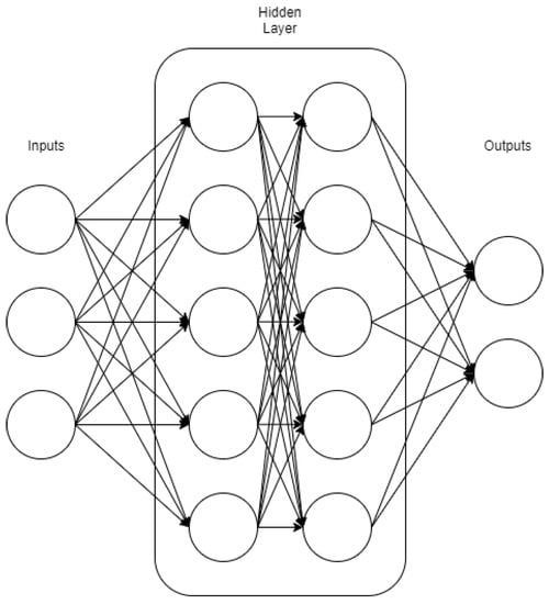 Neural Networks (NNs) are algorithms used in machine learning to solve problems via data processing. Input data move through a series of interconnected nodes, where each node is weighted initially and re-calculated as the information passes through the network. Some everyday tasks include regression and classification. A general NN consists of an input, a hidden, and an output layer. The hidden layer may have multiple layers and use different algorithms in which data are processed [16]. Figure 4 shows the general layout of a Neural Network with two hidden layers.