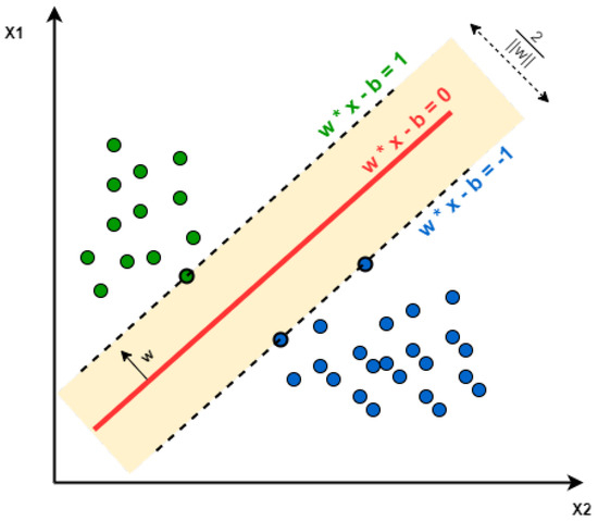 A Support Vector Machine (SVM) algorithm is used to classify unlabeled data points into two labeled categories. It learns to separate a cluster of data points into distinct binary groups [34]. Figure 5 shows a cluster of data points classified into class 1 (green) and class 2 (blue). In brief, SVM performs complex data transformations depending on the selected kernel function, and, based on these transformations, it tries to maximize the separation boundaries between data points depending on the labels or classes that we have defined.