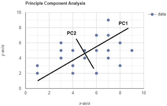 Principal component analysis (PCA) is a data manipulation or reduction technique that reduces the dimensions of a data set while minimizing the amount of information lost, as presented in Figure 7. To do this, the initial variables are transformed into a new set of variables called principal components. PCA also works around the fact that the principal components are ordered. As a result, the beginning components keep most of the information [43].