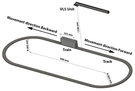 The experimental setup in our previous work consisted of the aforementioned VLS unit, incorporating the LED as the transmitter and the RGB photodiode as the receiver. The moving object, the Lego train, equipped with the retroreflective foils moves on the train tracks that resemble the shape of the number zero with the straight parts of this track layout, being 115 cm in length. The VLS unit is placed on a metallic bar facing downward toward the rails over one of the straight parts. The VLS unit is aligned with the tracks in a way that the LED and PD are over the center width of the rails. Identical to our previous work, we used the same flooring material under the experimental setup. Figure 1 shows a sketch of the new experimental setup, with the improvements of an increased distance between the VLS unit and the rails, which was 68 cm in our previous work, of 1.1 m, and that no light barrier alongside the track is necessary for triggering purposes, which is discussed in detail in this subsection. Furthermore, also the movement directions applied for the later discussed (see Section 2.4) movement direction determination are included in Figure 1.
