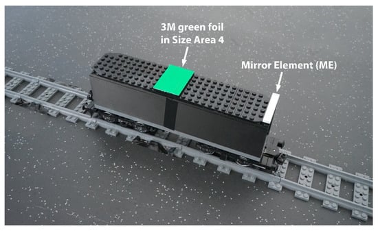 In order to establish a precise and unique triggering mechanism, we devised the following approach. The retroreflective foils placed on the train affect certain reflectivity parameters and, therefore, “cause” very different output values of the three color channels. Triggering the data acquisition utilizing the reflections of the foils is not a feasible solution since, for example, the green foil “causes” a precise and detectable peak value in the green channel, whilst, for example, the red foil does not cause such a peak value in the green channel. Therefore, according to this example, the triggering event might be detectable in the green channel for the green foils but not for the red foils. This already demonstrates that in order to establish a unique and generally applicable triggering mechanism, we have to use a different approach. Furthermore, the triggering event must not affect the acquisition of the reflected light of the foils. Following these two requirements for performing a unique and generally applicable triggering event that does not affect the foil determination, we devised a solution approach for which we incorporated a specular reflective element on the train. The most straightforward way to establish such an element is to use a mirror. In this work, we used a commercially available plastic mirror, consisting of a plastic body covered with a specular reflective foil, which was cut to the same size configuration as it is defined for Area 1, 0.7 cm × 4.7 cm (see Table 2). This mirror element, which in the following is abbreviated as ME, was then placed at one edge of the train platform. Figure 3 shows the train equipped with the ME and a 3M green foil in the size configuration of Area 4.