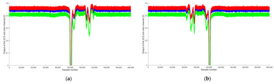 By utilizing the specular reflecting ME, we can anticipate two characteristics, which will fulfill two requirements. First, since the ME will reflect the complete spectrum of the impinging light, in contrast to the colored foils, the resulting reflections will be measurable for all three color channels, and since the reflectivity of a mirror is usually between 80% and 99%, the intensity of the reflected light will also be unique compared to the intensities of the individual colored foils. Second, as the ME is specular reflecting, we can also anticipate that only when the ME is close or directly under the VLS unit, the ME will reflect light back toward the photodiode. This will furthermore result in clear and steep flanks in the acquired data of the color channels over a short time interval. Figure 4a,b shows an exemplary zoomed-in view of the acquired outputs of the three color channels (depicted with their respective channel colors, y-axis) over time, given as sample numbers (x-axis) when the train passes under the VLS unit with the speed setting of Speed 3. Please note that in these figures, the data from the oscilloscope were already resampled, as described before, to emulate a sampling rate of 100 kHz. For these exemplary measurements, the shades of the laboratory room in which the setup was assembled were closed, blocking the sunlight, and also the ambient room lighting was turned off, leaving the LED of the VLS unit as the only active light source during these experiments. In order to make sure that there were no reflections from the utilized colored foils, we only placed the ME on the train (at the position shown in Figure 3). Figure 4a shows the output values for the movement direction Forward and Figure 4b for the movement direction Backward (see Figure 1).