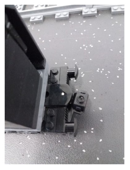 From the run of the curves shown in Figure 4, we can clearly observe that our anticipations regarding the utilized ME are correct since the expected clear and steep flanks for all three color channels are clearly deductible. Furthermore, also our second requirement, that the ME will not interfere with the reflections of the foils, is fulfilled, as we discuss in the following. As mentioned before, the train was only equipped with the ME and there were no retroreflective foils placed on the train. When the train is moving in the Forward direction (see Figure 4a), the course of events is as follows. At the beginning of the curve shown in Figure 4a, from sample number 0 to around sample number 80,000, the train is not under or close to the VLS unit; therefore, only the stable reflections from the surroundings are acquired. At sample number 100,000, the Lego train has entered the detection area of the VLS unit and the anticipated clear and steep flanks, due to the ME, can be seen. It is important to point out that, as verified by the measurements and intended in our solution approach, for a triggering mechanism without the need of placing the light barrier in the infrastructure, the flanks are present in all of the three color channels. Thus, we can perform the triggering for the acquisition based on a falling flank detection. As the train moves along with the given speed, a second clear and steep flank occurs (at sample number ~102,000), when the ME moves out of the VLS unit. Since in the moving direction “Forward”, the train platform (black plastic material) reflects most of the light back to the VLS unit, we can observe a period (sample number 102,000 to around 110,000), where the impinging light on the RGB photodiode is a mixture of the reflections from the ME as it almost moved out from the detection area of the VLS unit and the black plastic material. This is followed by the almost stable reflections from the black material when the “main body” of the Lego platform is under the VLS unit (see sample numbers 110,000 to 125,000). Please note that no retroreflective foils were placed on the train, but, as we show later, in this “region”, the reflections from the retroreflective foils are acquired once they are attached. From sample number 125,000 to 150,000, when the train has moved out of the detection area of the VLS unit, we can see an effect caused by the mechanical and materials related setup of the train. In this “region” two effects take place. First, as the train moves out of the detection area, the “main body” of the train no longer contributes to the acquired reflections, and the coupler, which is usually used to connect another wagon to the train, enters the detection area of the VLS unit. This coupler has a different surface structure than most parts of the train, where the surface is structured with the known connection knobs typical for Lego. This is clearly observable with the bare eyes as shown in Figure 5.