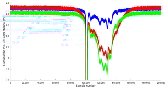 In order to show that, as our second requirement, utilizing the ME does not interfere with the determination of the retroreflective foils, we want to exemplarily show the acquired outputs of the three color channels (in their respective colors, y-axis) over time, given as sample numbers (x-axis) in Figure 6, for the case that the train is additionally equipped with the retroreflective foils. For this example, we chose the setup as shown in Figure 3, where the 3M green foil in the size configuration of Area 4 is placed on the train. The speed of the train was again set to Speed 3, and the movement direction was Forward.