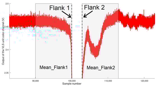 In order to exploit this fact, we implemented a movement direction determination process. At first, a self-developed algorithm determines the positions in terms of sample numbers of the two flanks “caused” by the ME. In the following, we name them Flank 1 and Flank 2. Flank 1 (falling flank) occurs when the ME enters the main detection area of the VLS unit and Flank 2 when the ME leaves it. The algorithm is based on building the difference from one sample (sample number n) to the sample with the sample number n + 50. A negative difference yields a falling flank and a positive difference value a rising flank. From this simple algorithm, we follow that the lowest negative difference indicates the steepest part of the falling flank, and the highest positive difference value indicates the steepest part of the rising flank. Once these minimum and maximum values are found, the corresponding sample numbers are consequently defined as the positions of Flank 1 and Flank 2. From the positions of these two flanks, we now calculate the mean values of the red color channel of 10,000 samples before Flank 1 and 10,000 samples after Flank 2. These two mean values are hereafter referred to as Mean_Flank1 and Mean_Flank2. For a simpler graphic explanation, please see Figure 7, where we show Flank 1 and Flank 2 (dotted black lines) as well as the periods for the calculations of Mean_Flank1 and Mean_Flank2 (labeled greyish areas) for the red channel of the data used for Figure 4a, in a zoomed-in view.
