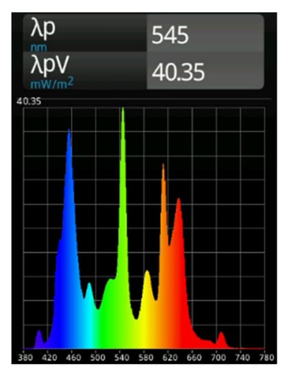 As mentioned earlier, we changed the LED type in our VLS unit to a CREE MC-E RGBW LED. With this modified experimental setup (different LED type, increased distance) and with the described applied power supply setting, this now results in an illuminance of ~500 lux at the surface of the reflective foils on the train. Figure 2 shows the spectral power distribution of the impinging light on the surface of the train on the base of the applied LED. The spectral power distribution as well as the lux value were measured with a handheld MK350S PREMIUM spectrometer.