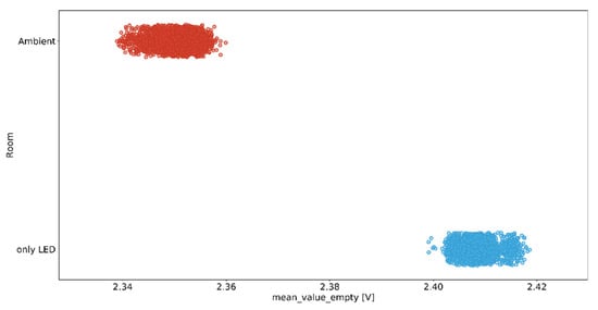 This scatter plot shows the clear distinguishability of the two settings. This consequently proves that by calculating the mean value during the known absence of the train can be used to determine whether only the LED was on or if, additionally, the ambient room lighting also was switched on. As a consequence of this clear distinguishability, we can also infer, based on this parameter, the applicable model of the random forest and generally that our system is also able to perform the task of ambient light determination.