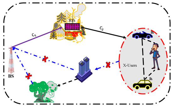 Consider a manufacturing block of ABC Ltd. as shown in Figure 4, one BS has antennas. RIS connects BS, and the plane of BS is YZ, whereas the plane of RIS is XZ. There are reflecting elements of RIS. This surface serves users. There is no line of sight (LOS) between the user () and the BS due to hurdles. is the channel between BS and RIS, and is the channel between the RIS and the ith UE. Θ is the phase shift matrix of the RIS.