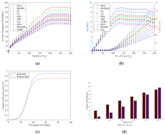 The performance of the proposed algorithm is compared with the plethora of algorithms such as particle swarm optimization (PSO) [29], firefly algorithm (FA) [30], artificial bee colony (ABC) [31], cuckoo search (CS) [32], teaching learning-based optimization (TLBO) [33], basic open-source nonlinear mixed integer programming (BOMIN) [34], social group optimization (SGO) [35], mesh-adaptive-direct-search-algorithm (NOMAD) [36] and genetic algorithm (GA) [37] to compare and validate the results of the proposed algorithm. Figure 5 shows the complete performance analysis of the proposed algorithm. The throughput of the network for all the algorithms is shown in Figure 5a. The highest average Ω achieved by OAA is 90 Mbps. The proposed algorithm starts converging when the number of is greater than 180. Figure 5a also shows that the performance of the OAA is better than other algorithms.