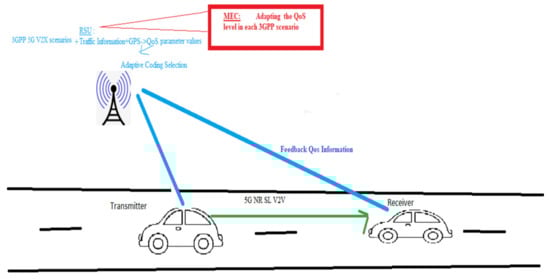 - Trivisonno, R.; Wei, Q.; Marquezan, C.C. QoS Enhancements for V2X Services in 5G Networks. In Proceedings of the 2020 IEEE 91st Vehicular Technology Conference (VTC2020-Spring), Antwerp, Belgium, 25–28 May 2020; Institute of Electrical and Electronics Engineers (IEEE): Piscataway, NJ, USA, 2020; pp. 1–5. [Google Scholar]