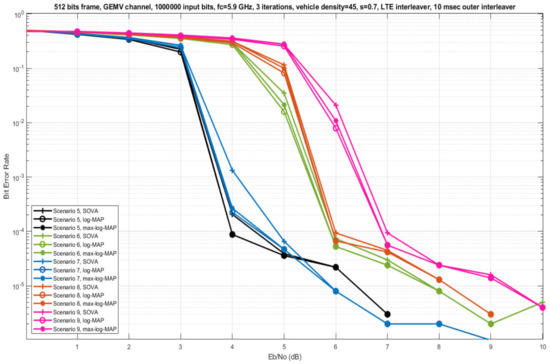 - Del Puerto-Flores, J.; Yllescas, L.C.; Parra-Michel, R.; Pena-Campos, F.; Cortez, J. Performance Evaluation of Turbo Decoding in DFTS-OFDM Systems Over V2V Channel. In Proceedings of the 2018 IEEE 10th Latin-American Conference on Communications (LATINCOM), Guadalajara, Mexico, 14–16 November 2018; Institute of Electrical and Electronics Engineers (IEEE): Piscataway, NJ, USA, 2018; pp. 1–5. [Google Scholar]
