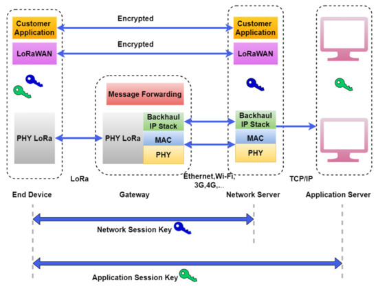 In addition, NS discards duplicates of messages received by multiple GWs. In other words, it acts as the orchestrator of the whole network. Within its main objectives are ensuring security, scalability, and reliability of data routing throughout the network. On the other hand, the AS oversees the safe handling, management, and interpretation of the data, while encrypting and decrypting downlinks and uplinks, respectively. In addition, the AS generates all downlink payloads to the connected end-devices. In order to provide confidentiality, the top-level payload is encrypted with an application session key and for data integrity, a network session key is additionally used. Finally, communication between LoRaWAN GWs and NS is enabled through the internet protocol (IP) stack.