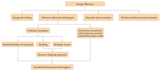 To understand and evaluate the proposed energy efficient mechanisms, it is helpful to categorize them. In [41], the authors categorized the aforementioned mechanisms to sleep/wake-up, data reduction, network and resource allocation techniques. This categorization has been made for the general field of low power short area networks (LPSAN), as well as low power wide area networks (LPWAN) between them and LoRa but each of these technologies has different advantages and limitations. Specifically, in the case of LoRaWAN, the main constraints are the limited available energy, the low data rate and the increased latency.