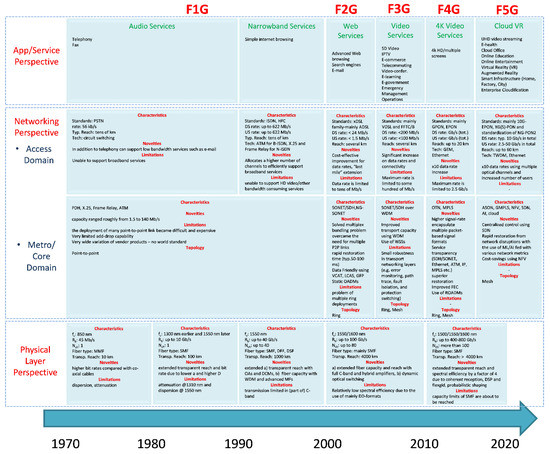 Each of the three layers has specified targets in order to serve the final user seamlessly and efficiently. In particular, the physical layer aims to increase the transport capacity and transmission reach. Next, the network layer is responsible for providing increased connectivity and reduced latency in order to attain sufficient quality of service (QoS) and reliability. Finally, the app/service layer is targeting towards maximizing the user’s quality of experience (QoE). Our procedure regarding the five generations is dialectical, as it follows an evolutionary manner; that is, the limitations of each generation are becoming the novelties of the next one. In this way, the burdens of each layer for each generation are becoming more distinguishable. This dialectical analysis reveals that each layer evolved at a different pace, as the evolutionary drivers and the limitations are completely different among the three layers. For example, the app/service layer evolved rapidly after 2005 due to the introduction of video services, the access part of the network layer showed significant advances even from the first generation, while the backbone part of the network layer blossomed after 2000 due to the success of Synchronous Optical NETworking (SONET)/Synchronous Digital Hierarchy (SDH). Finally, the physical layer shows a more balanced evolution over the 50 years (1970–2020) and significant technological advances can be found in all five decades. As a consequence, in the app/service layer and in the network layer, the timeline of the F5G group is followed; however, in the physical layer, a different timeframe is considered in order to designate all the principal milestones, as shown in Figure 1. In the next three sections, we analyze the evolution of the fixed networks from three different perspectives.