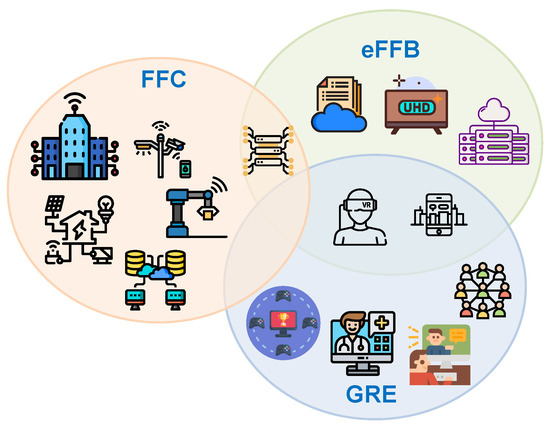 The F5G services, based on their requirements, can be classified into three categories, as illustrated in Figure 3, namely enhanced fixed broadband (eFBB), full fiber connection (FFC) and guaranteed reliable experience (GRE). The eFFB category includes services that require fixed broadband connections with data rates greater than 1 Gb/s per user and per transmission direction. Representative services of this family are ultra-high definition (UHD) video streaming, cloud office and virtual/augmented reality. Next, the FFC category demands full fiber coverage and massive/dense fiber connections. Smart infrastructure (cities, campuses, homes and manufacturing), enterprise cloudification and the interconnection with the 5G network can be incorporated into this family. Further, the GRE model mainly includes services which aim to maximize the user’s QoE, such as online e-learning, online gaming, virtual/augmented reality, real time social networking and e-health. The main metric of interest here is the low latency in order to ensure seamless service operation along with great QoE.